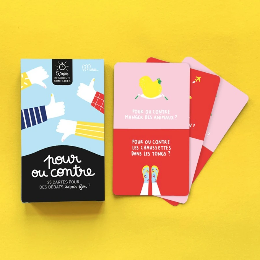 Rien n’est jamais tout blanc ou tout noir ! Avec Pour ou Contre ?, lancez-vous dans des joutes verbales hilarantes et passionnées. Que le sujet soit sérieux ou totalement loufoque, ce jeu de 50 débats invite petits et grands à exprimer leur avis et à écouter celui des autres. Un format de poche indispensable pour faire pétiller vos moments ensemble, que ce soit pour 5 minutes ou pour des heures !