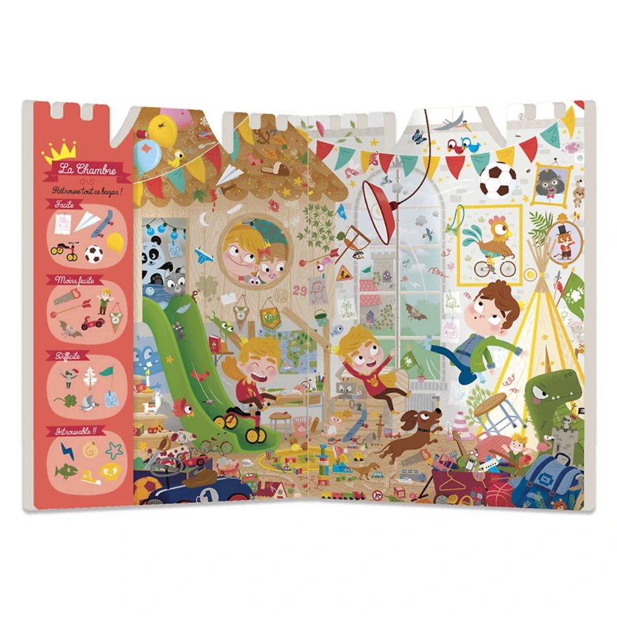 Un grand cherche‑et‑trouve plein d’humour dans le château du Prince Dufouillis. 26 éléments à retrouver, avec plusieurs niveaux de difficultés pour s’adapter à différents âge, dans chaque pièce pour jouer seul ou à plusieurs dès 3 ans.