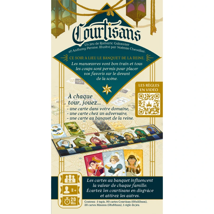 - Contenu : 90 cartes Courtisan, 20 cartes Objectif, 1 tapis de jeu, livret de règles