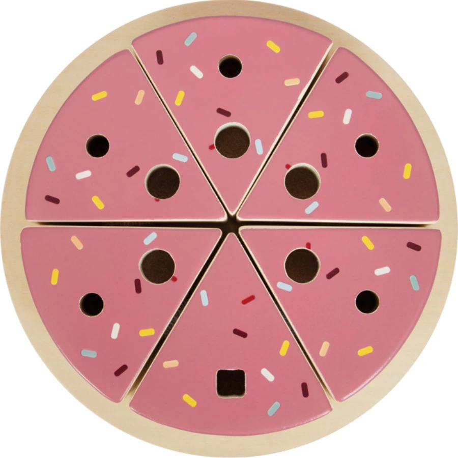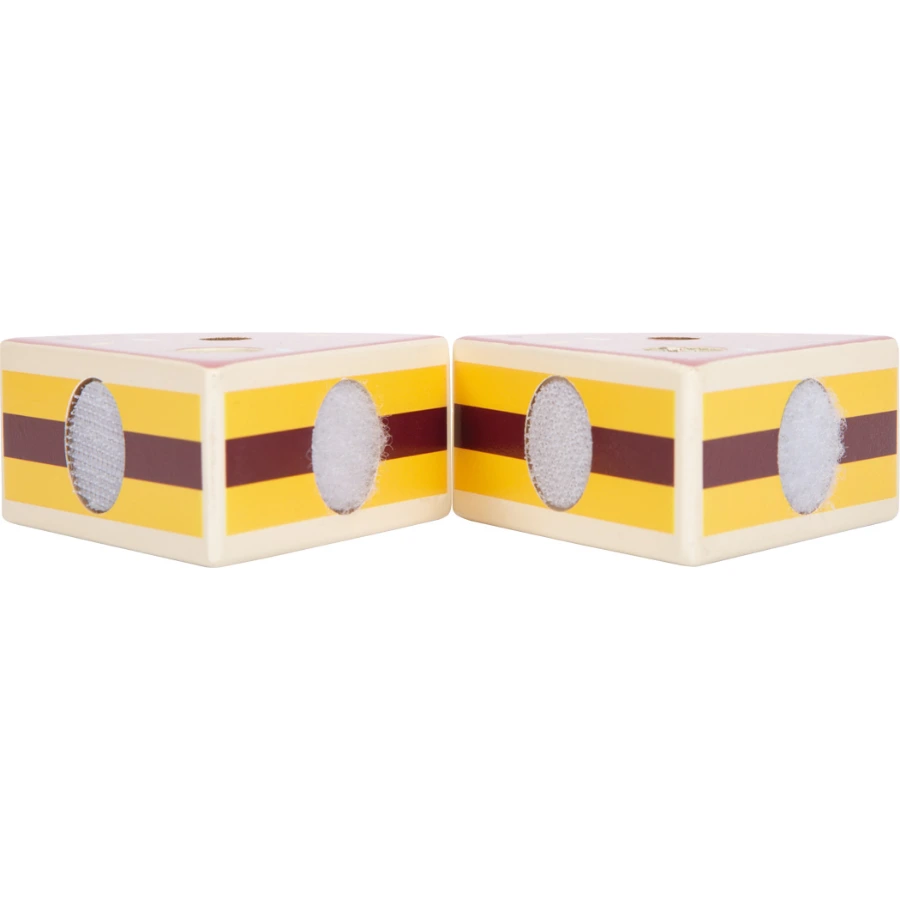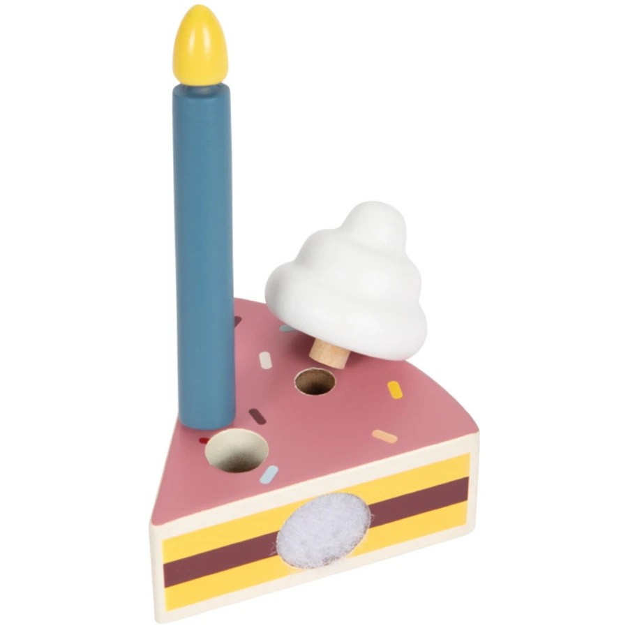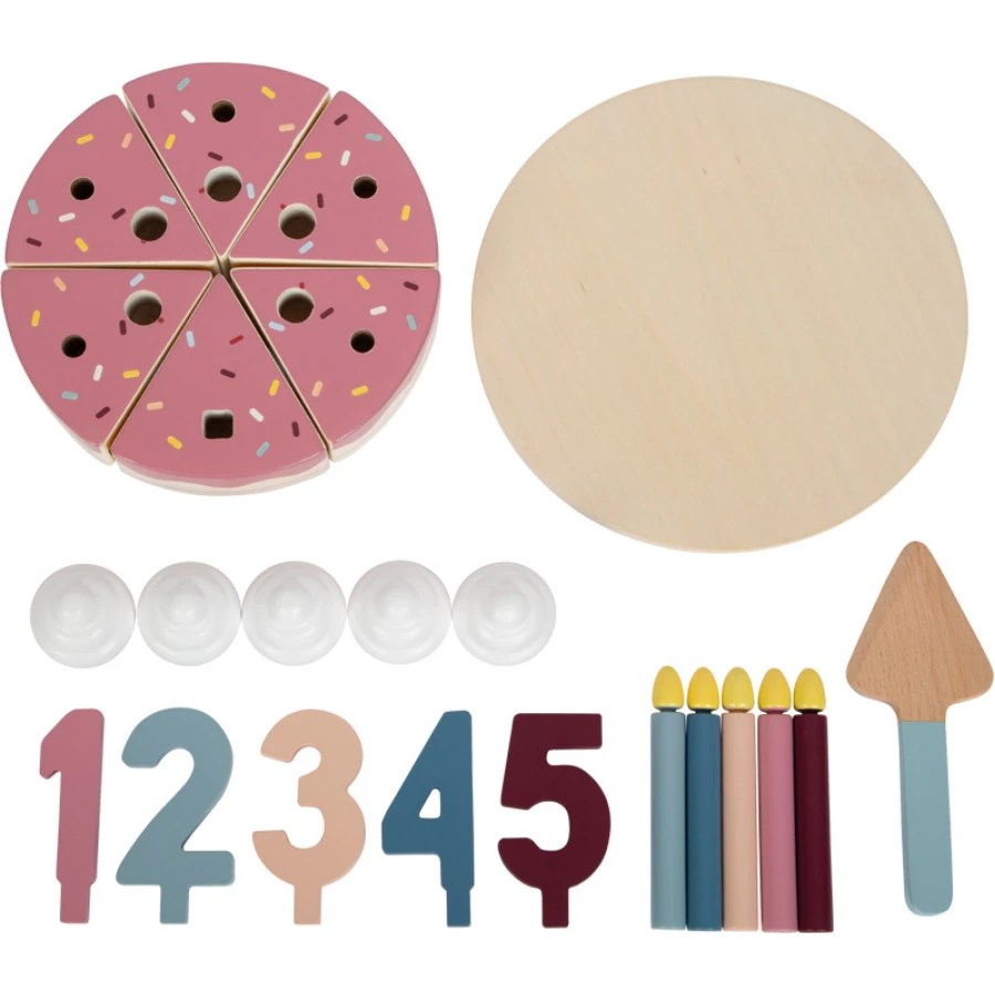 Un gâteau d’anniversaire en bois à découper, décoré de crème et vermicelles colorés. Avec 6 parts, 5 bougies, chiffres interchangeables et accessoires. Idéal dès 24 mois.