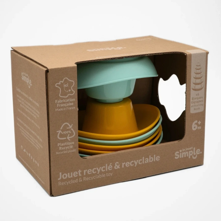 Un ensemble de 6 barques gigognes pastel turquoise & jaune, fabriqué en France par Le Jouet Simple. Jouet de bain, d’éveil et de construction, lavable et recyclable.