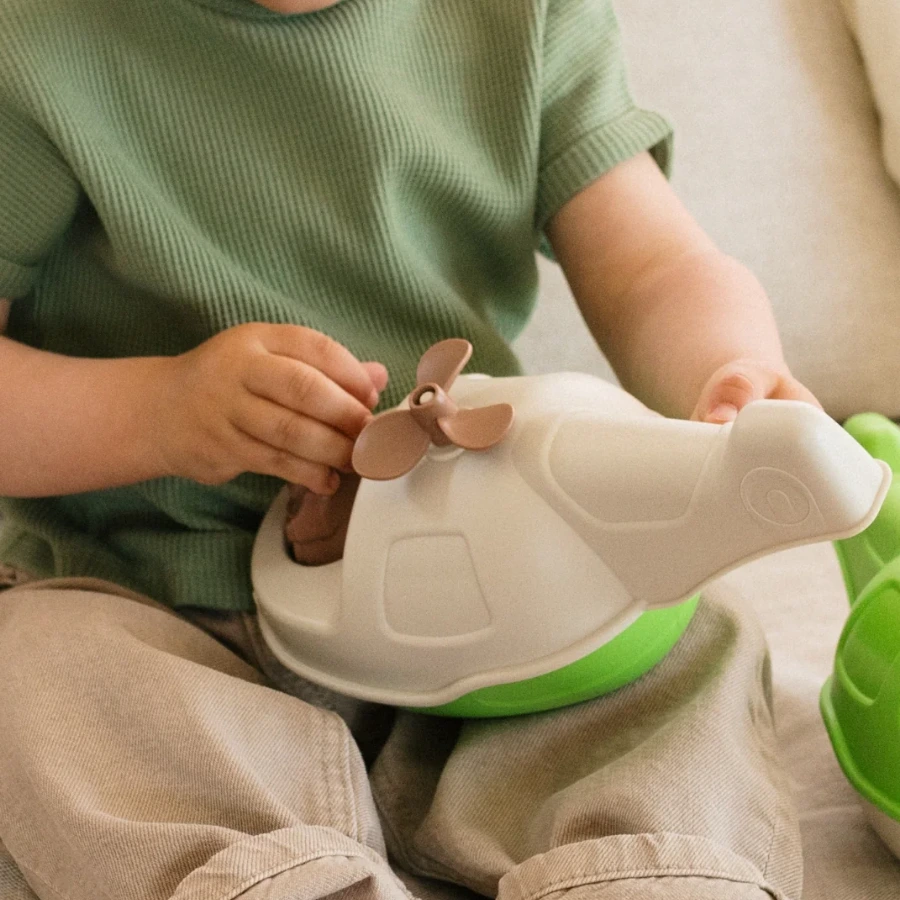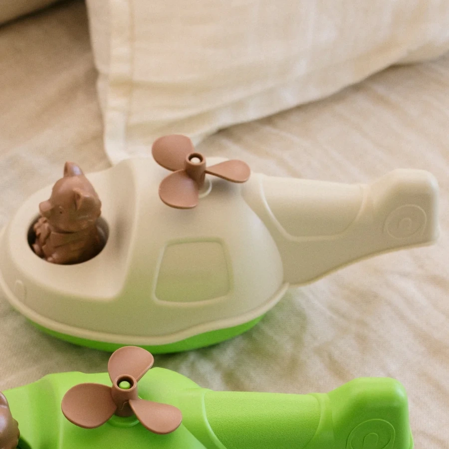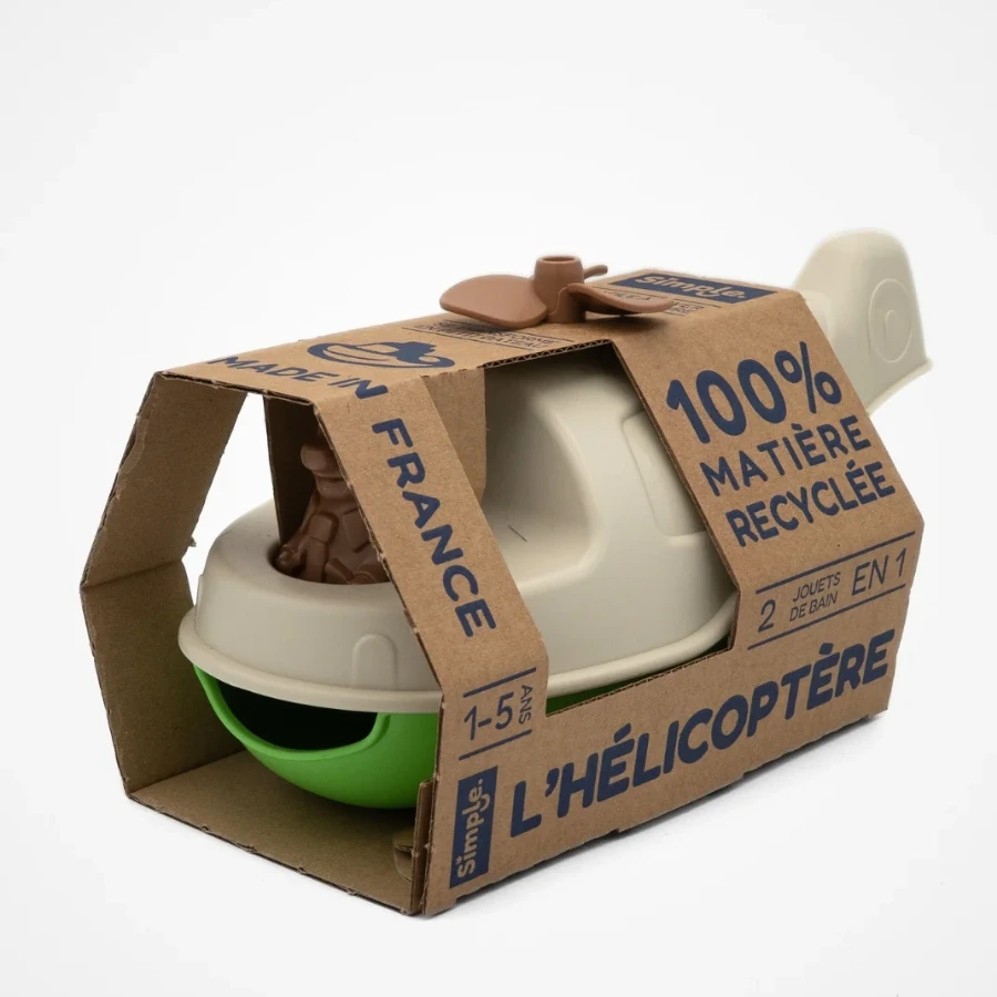 Le Jouet Simple ne fait aucun compromis sur l’éthique et la qualité. Cet hélicoptère est fabriqué à 100% en France. La matière première provient de Normandie, où des flacons de gel douche et des bouteilles de lait (PEHD) sont transformés en jouets extraordinaires. L’assemblage final est réalisé à la main dans un atelier des Pays de la Loire. Ce circuit court garantit un produit sans BPA, sans phtalates et sans aucune petite pièce dangereuse.