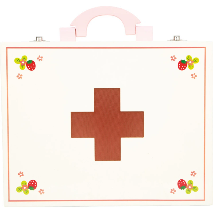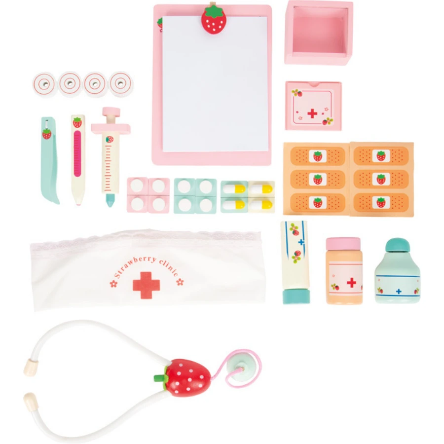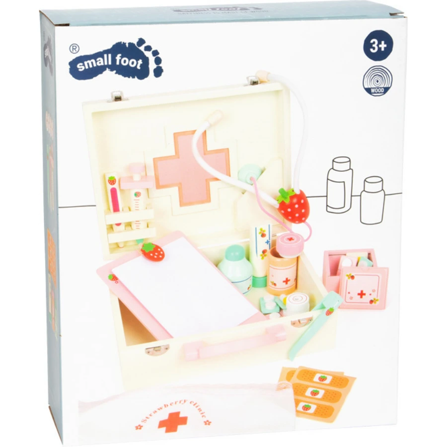Mallette de docteur en bois avec accessoires réalistes et motifs de fraises. Idéale dès 3 ans.
