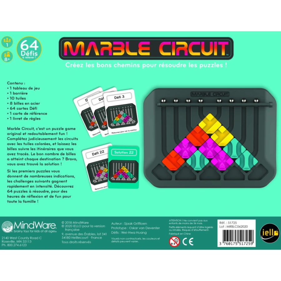 - Contenu : 1 plateau de jeu, 64 cartes Défi, 8 tuiles de circuit, 6 billes métalliques, 1 livret de règles