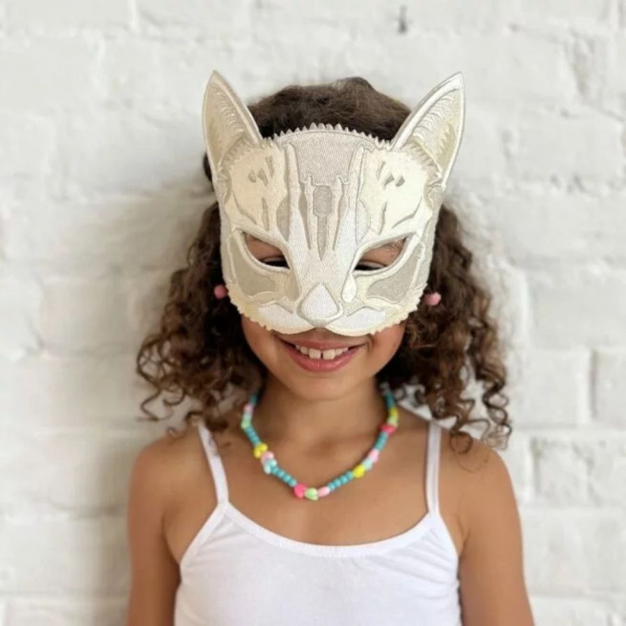 Un masque brodé en forme de chat, souple et raffiné. Fabriqué en France, il est parfait pour les déguisements et les jeux imaginatifs.