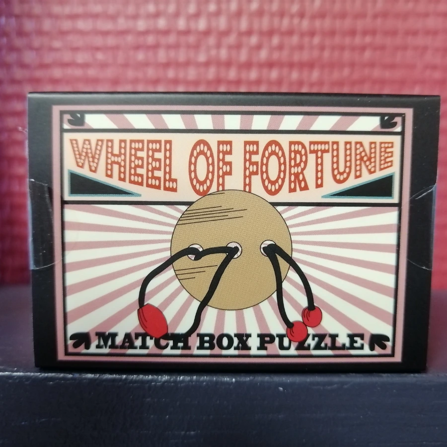Mini-casse-tête La Roue de la Fortune, bois et corde, dans une boîte d’allumettes signée Professor Puzzle.