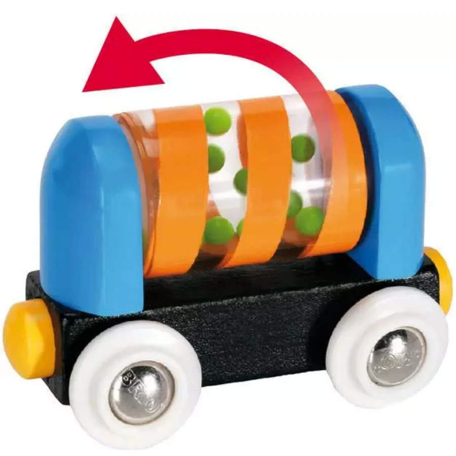 Le wagon ludique contient des billes qui tournent lorsqu’il roule, ajoutant une dimension sensorielle et amusante au jeu.