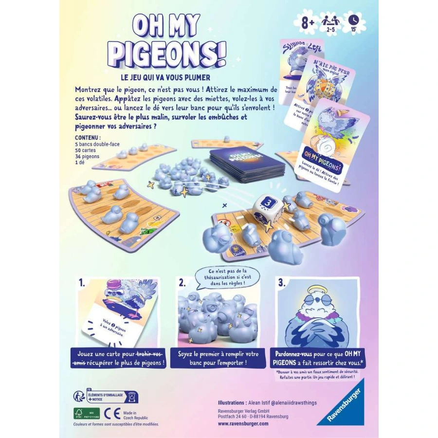 Dans Oh My Pigeons !, chaque joueur tente de devenir le maître du banc en remplissant le sien de pigeons avant les autres. À votre tour, vous jouez une carte pour attirer des pigeons, voler ceux des adversaires ou envoyer des fientes pour les faire fuir.