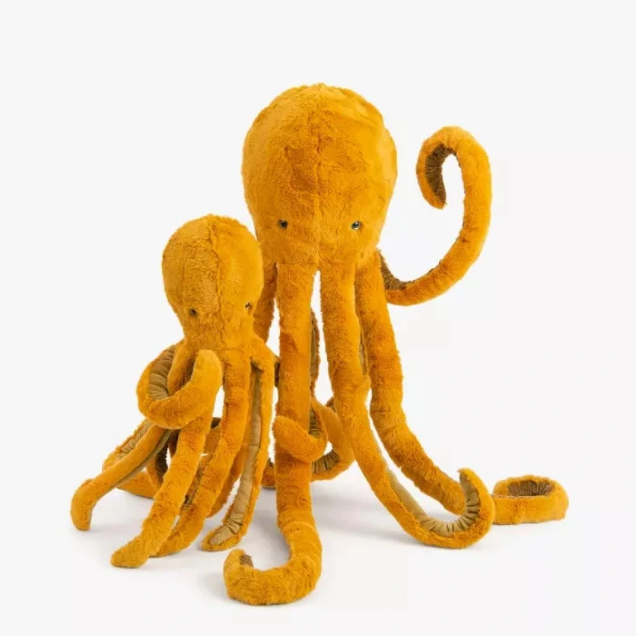 Conçu en coton, polyester et plastique, ce poulpe offre des textures variées qui éveillent le toucher. Ses tentacules douces rappellent les peluches utilisées pour les bébés prématurés, connues pour leur effet apaisant. Sa taille de 45 cm (tentacules inclus) est généreuse sans être encombrante.