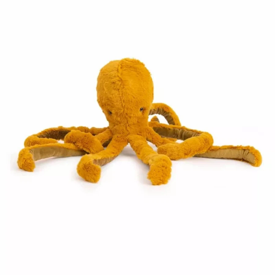 Le petit poulpe de la collection Tout autour du monde par Moulin Roty est une peluche pleine de tendresse et de fantaisie. Avec ses tentacules souples, son regard doux et son pelage jaune lumineux, il évoque les créatures marines qui peuplent les fonds océaniques. Ce poulpe ne fait pas peur : il rassure, amuse et stimule les sens.