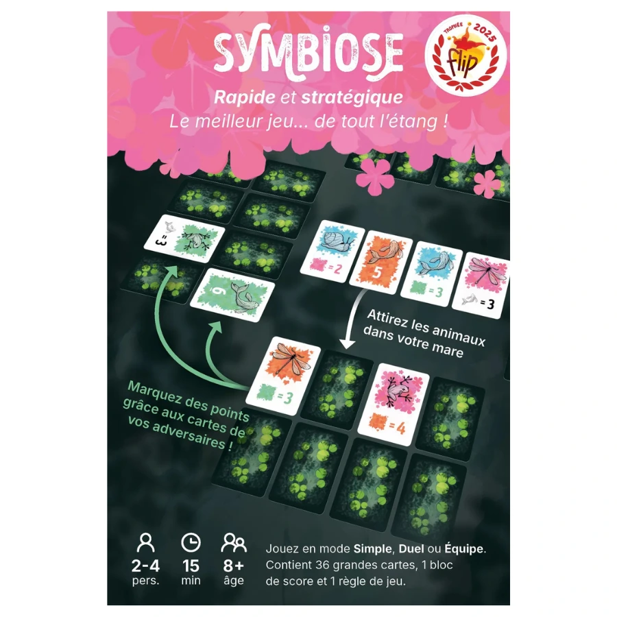 Dans Symbiose, développez votre mare personnelle à partir de la rivière et tentez de créer la plus belle synergie entre vos cartes et celles de vos voisin·es. Vos points dépendent en partie des autres joueurs, ce qui rend chaque partie unique et pleine d’interactions.