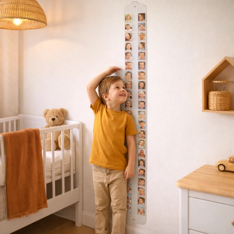 La toise double porte‑photos est bien plus qu’un simple outil de mesure. Elle devient un véritable témoin du temps qui passe. Grâce à ses deux colonnes, les parents peuvent suivre la croissance de deux enfants en parallèle et glisser leurs photos pour voir leurs frimousses évoluer au fil des mois. Chaque mesure devient un petit rituel, chaque photo un souvenir précieux.